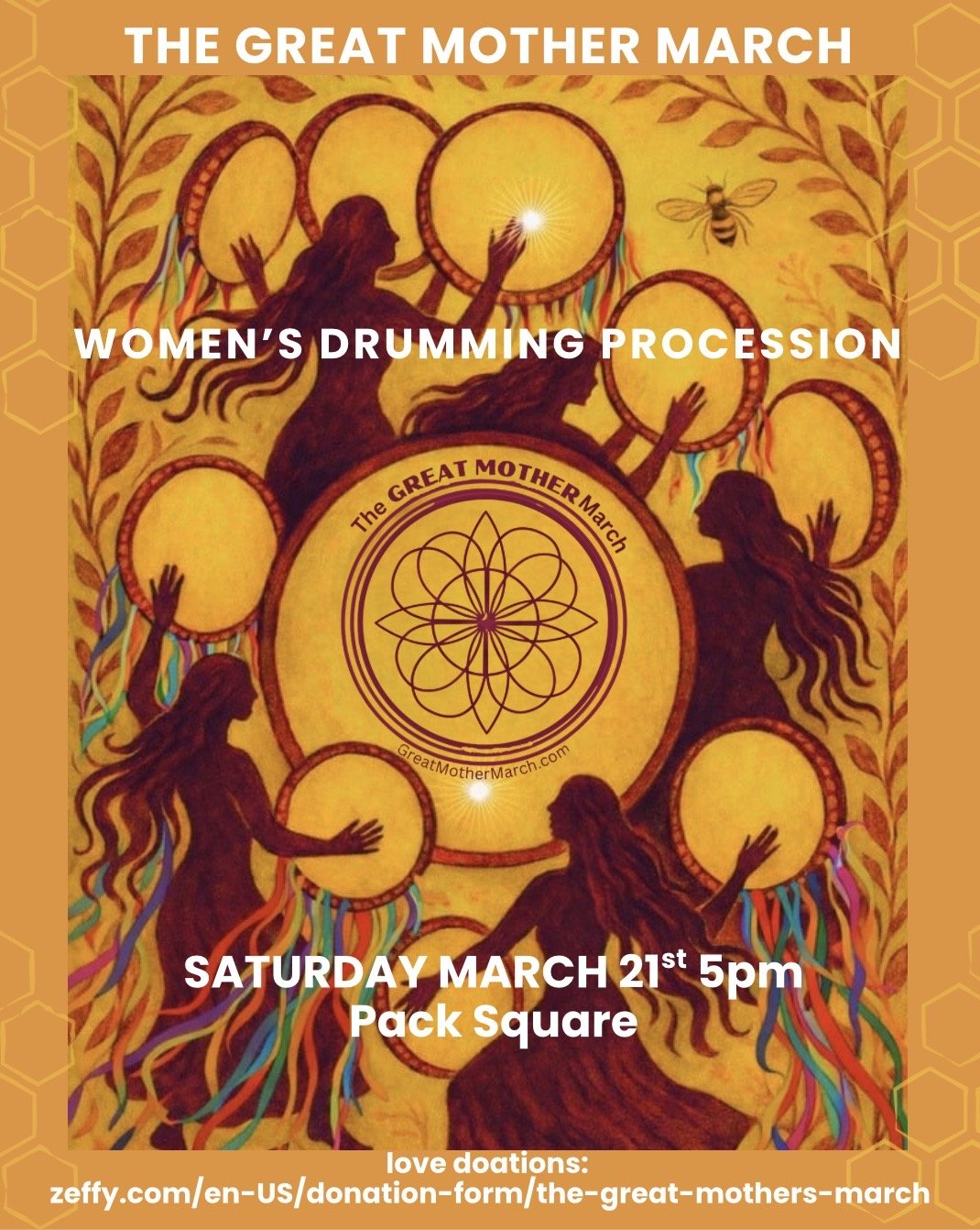 My heart is so elated in the warm welcoming to gather women for a drumming procession on March 21st in downtown Asheville at Pack Square. This is an opportunity to drum in the name of the Great Mother, as the community blesses and sends off those who will be pilgrimaging from Asheville to Washington D.C. in the Great Mother March.